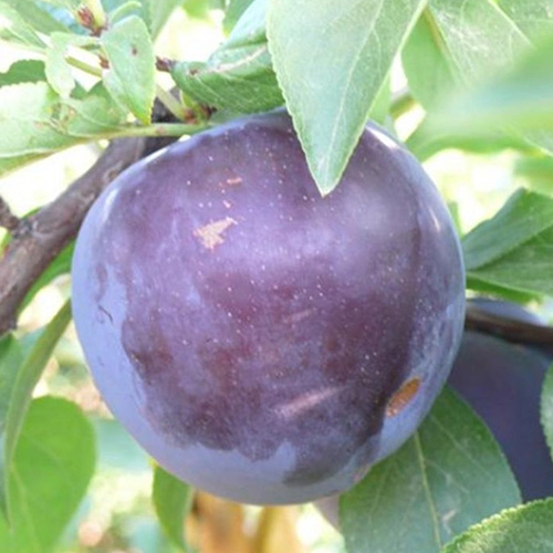 Fruit Prunier Black Splendor : Les fruits sont exceptionnellement gros pour une prune, chaque prune pesant souvent plus de 100 grammes. La peau est lisse et violet foncé, presque noire, tandis que la chair a une saveur douce et légèrement acidulée, ce qui la rend excellente pour la consommation fraîche, les confitures et les utilisations culinaires.